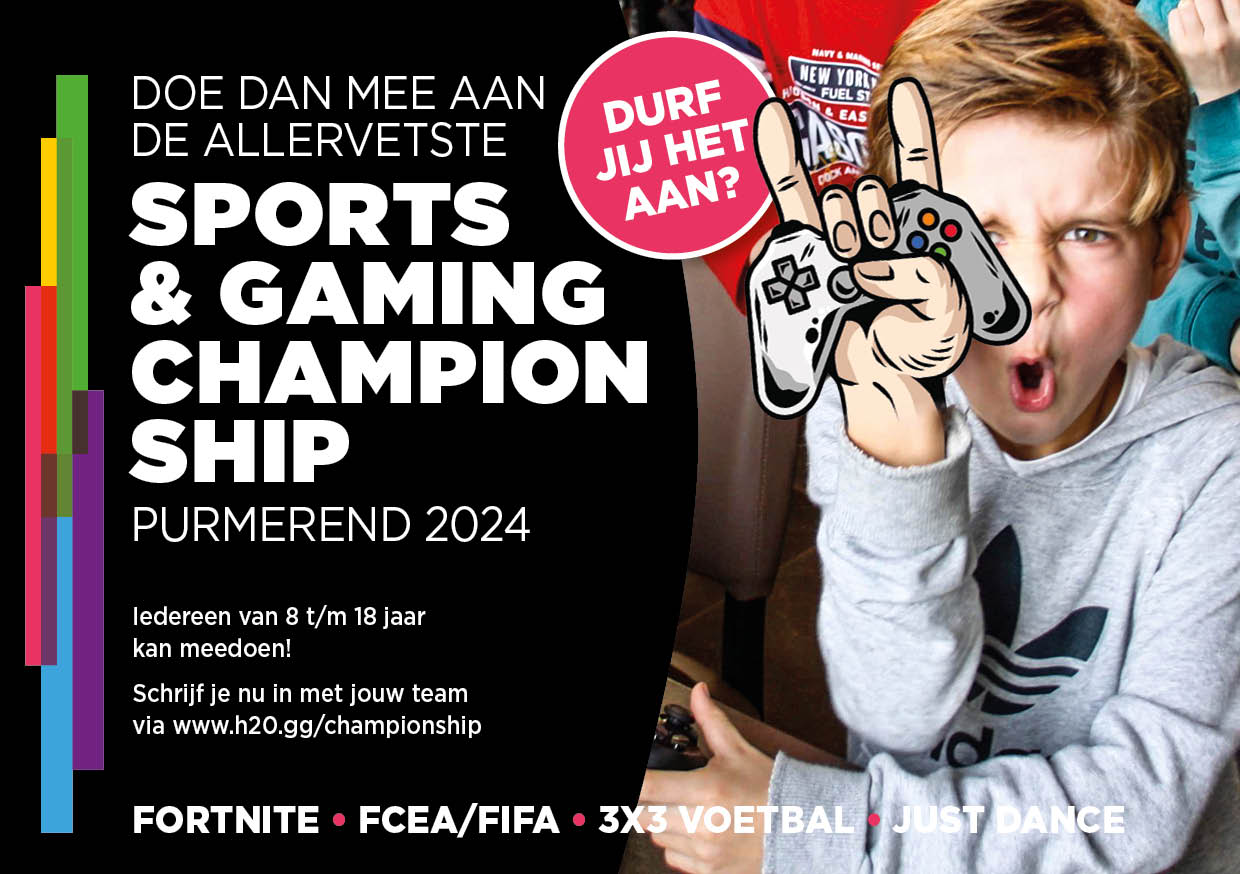 Het Sports & Gaming Championship Purmerend is hét kampioenschap waar iedere jongere uit Purmerend in de leeftijdscategorie van 8 tot en met 18 jaar aan mee kan doen. Het bijzondere van dit kampioenschap is dat je niet alleen moet kunnen gamen, maar ook een beetje kunt voetballen of dansen (Just Dance). Je maakt in verschillende categorieën kans op een totale prijzenpot van 1.200 euro en diverse game prijzen.