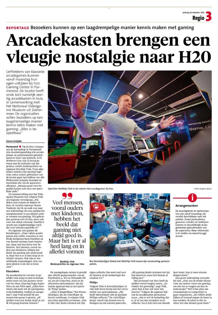 Les amateurs de jeux d'arcade classiques pourront se régaler dès lundi au H20 Gaming Center de Purmerend. En effet, le site dispose depuis peu de quarante bornes d'arcade, en collaboration avec le Musée national du jeu vidéo de Zoetermeer. Les organisations souhaitent permettre aux visiteurs de découvrir le jeu vidéo de manière accessible. « Tout est jouable. »